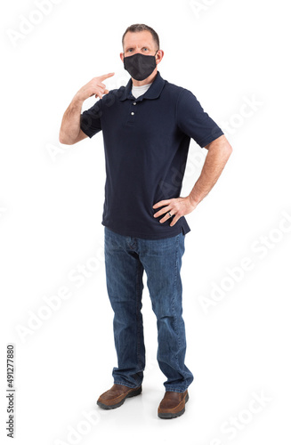 Man Points To Cloth Face Mask He Is Wearing