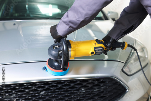 Man polishing car with orbital polisher indoors, closeup