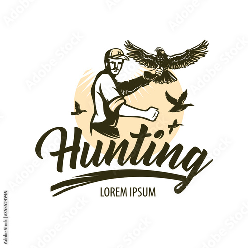 Man practicing hunting with falcons. Hawk with spread wings sits on the hunter's hand. Predator species with broad wings, sharp beaks and claws.