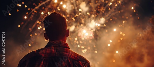 Man preparing for New Year celebration with fireworks, closeup rear view.