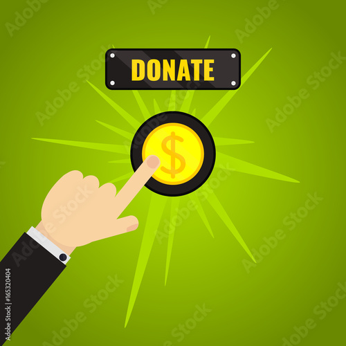 Man pressing donate button. Giving money, fundraising business concept. Financial contribution to charity online. Internet banking, mobile payments. Touch, push or press symbol. Vector illustration.