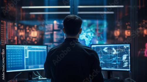 Man, programmer and coding for networking, malware or cyber security specialist.
