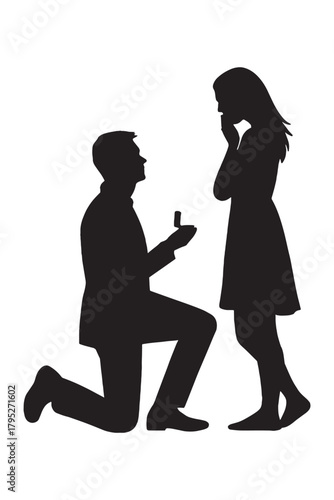 Man proposes with engagement ring, woman reacts with surprise and joy in a romantic silhouette scene