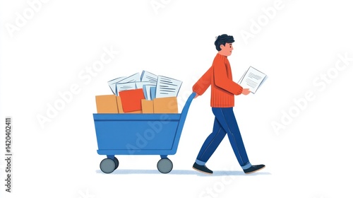 Man pulling cart with documents, walking right, holding papers for organization purposes