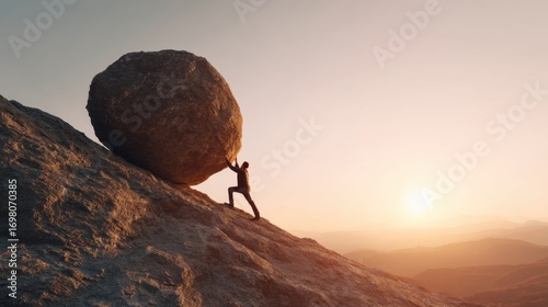 Man pushing large rock up a steep mountain at sunset, symbolizing struggle and overcoming adversity for business success and motivation.