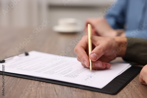 Man putting signature on document at wooden table, closeup