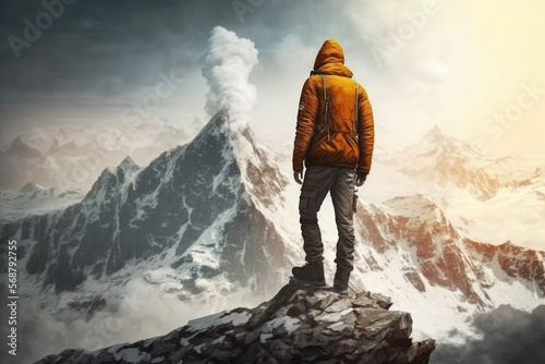 Man Reaching the Summit, man on top of a mountain. Ai generated