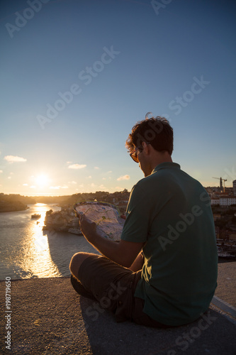 Man reading map at sunset in Porto, Portugal