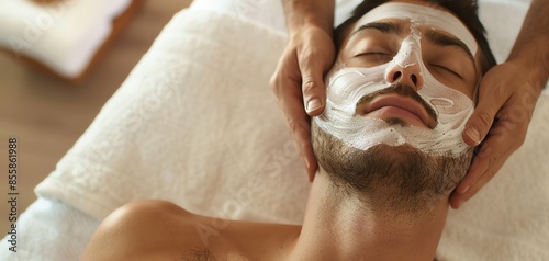 Man receiving relaxing facial treatment at spa. Close-up of therapist applying mask on client's face during skincare session.