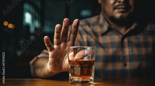 man refuses say no and avoid to drink an alcohol whiskey , stopping hand sign male, alcoholism treatment, alcohol addiction, quit booze, Stop Drinking Alcohol. Refuse Glass liquor, unhealthy, reject