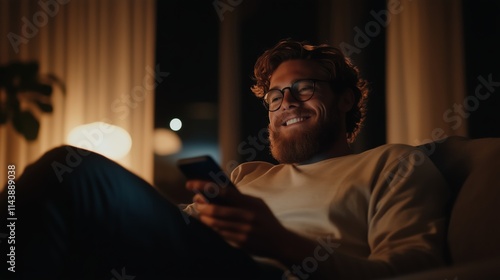 Man relaxing at home while enjoying a phone call in a cozy evening setting with warm lighting