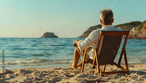 Man relaxing on deck chair at sandy beach. Summer vacation