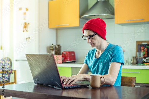 Man remotely works on a laptop at home. Distance work and online education. Useful pastime when you have to stay at home