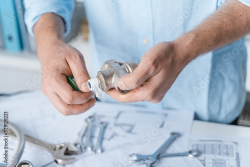 Man repairer,plumber using thread seal tape for reducer sealing. Plumbing works in house. Drawing,diagrams,plan, project of water supply.Making repairs at home.Accessories, hose,tap,adjustable wrench