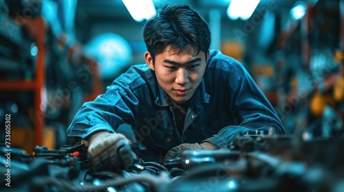 Man repairing a car in auto repair shop. Young Asian man in his workshop.