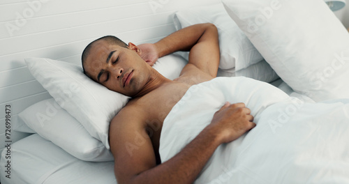 Man, resting and sleeping in bed at home, peace and dreaming or relax on sunday morning. Male person, comfortable and blanket for stress relief, lazy and house nap on soft bedding and calm on weekend