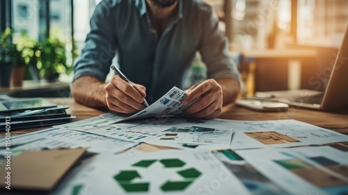 Man reviewing paperwork, pen in hand, surrounded by documents. Illustrates sustainable business practices, financial planning, or eco-conscious work.