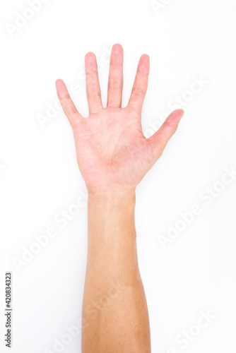 Man Right hand showing the five fingers, Hand held up and fingers outstretched isolated on white background.