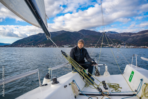 Man sailing a sports yacht in the Kotor Bay, Montenegro, showcasing adventure, freedom, and nautical sport.
