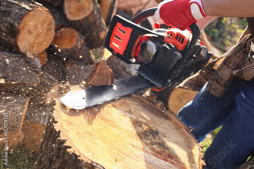 Man sawing wooden log on sunny day, closeup