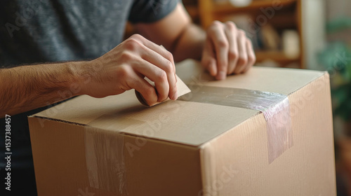 Man sealing cardboard box with adhesive tape indoors, closeup