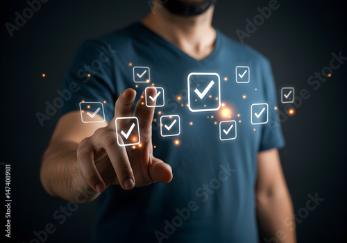 Man selecting checklist boxes with finger on virtual interface task management and productivity concept