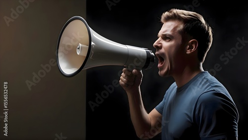 Man shouting into a megaphone with intense expression during a protest or announcement in a dramatic outdoor setting