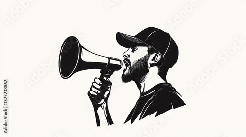 Man shouting through megaphone, protest, announcement, public speech, vector illustration