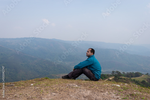 man sitting alone at hill top with misty mountain rage background from flat angle