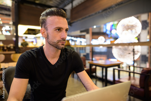 Man sitting at coffee shop using laptop computer and thinking