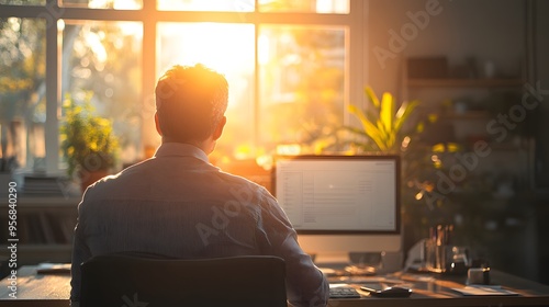 Man Sitting at Desk Facing Window with Sunlight Streaming In