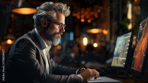 Man Sitting at Desk With Computer, Office Work, Technology, Business, Workplace, Productivity. Generative AI.