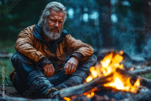Man sitting by a campfire in a forest during twilight surrounded by trees and smoke