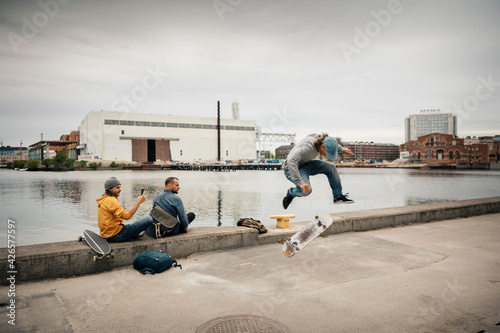 Man skating while male friend photographing through smart phone sitting by canal against sky