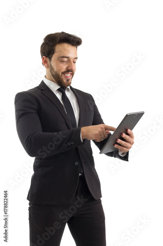 Man smiling and using tablet. Beautiful and elegant person is wearing black suit..