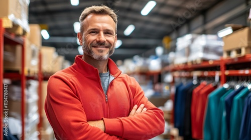 Man smiling confidently in a warehouse with shelves filled with merchandise.