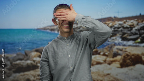 Man smiling with hand over face enjoying sunny day at seaside with rocky shoreline and clear blue sea under a bright sky