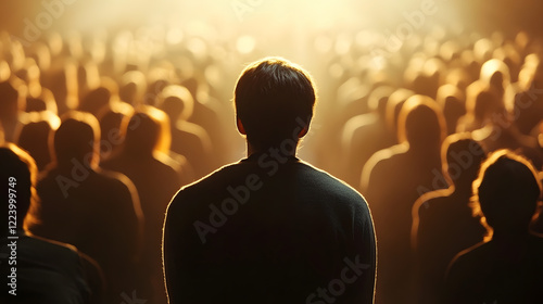 Man Standing Alone Facing Audience in Dramatic Spotlight Setting : Generative AI