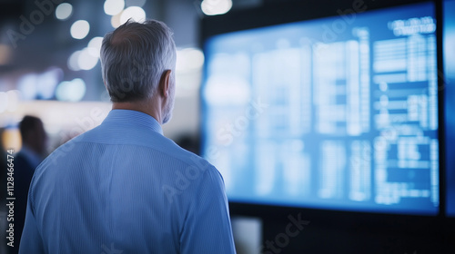 Man standing at airport terminal, gazing at large digital screen showing immigration policies, amidst bustling crowd and luggage, highlighting importance of travel regulations and border control infor
