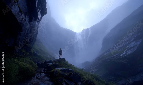 Man standing by a misty waterfall in a mountain gorge, tranquil scene, potential use in nature or travel promotional materials