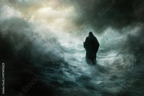 Man standing in dark ocean, waves crashing around him. Lone figure silhouetted against dramatic, stormy sky. Strength and solitude depicted.