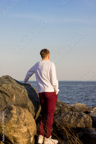Man Standing next to boulders on a background of sea at sunset and enjoying view