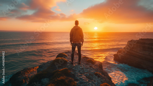 Man standing on a cliff edge with arms outstretched, embracing the breathtaking view of a vibrant sunset over the ocean, symbolizing freedom and adventure. Generative AI.