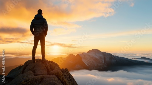 Man Standing on Mountain Peak Above Clouds During Sunrise with Stunning View