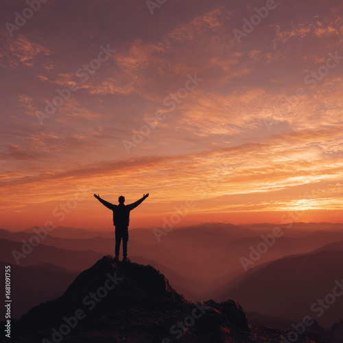 Man standing on mountain peak with arms raised at sunrise over scenic landscape