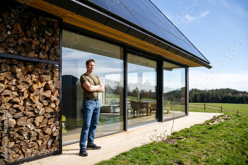 Man standing with arms crossed at patio of modern house