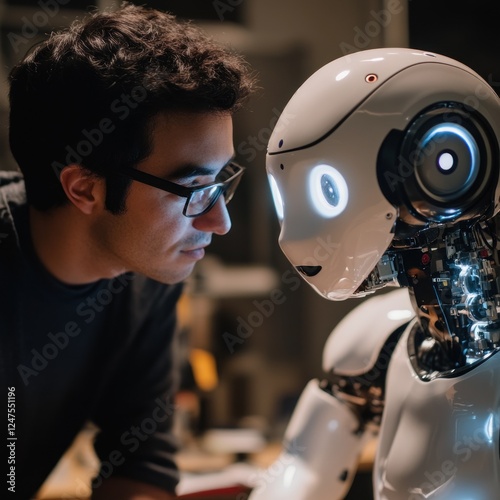 Man studying AI robot; lab background, future tech