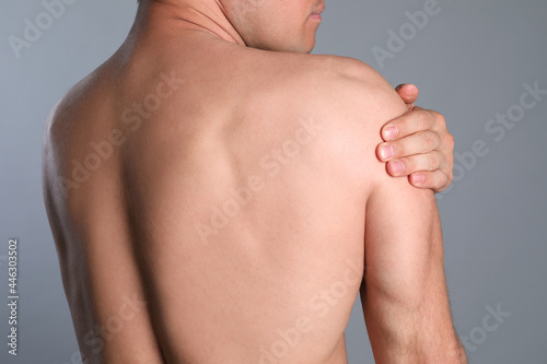 Man suffering from shoulder pain on grey background, closeup
