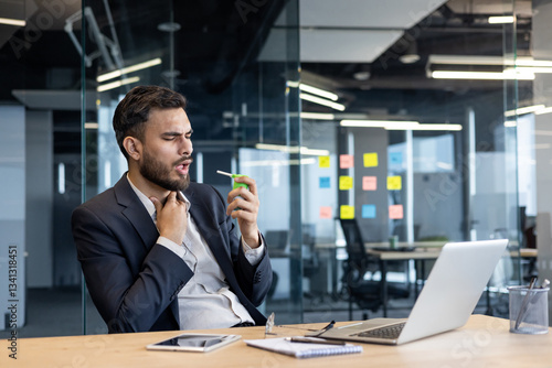 Man suffering from sore throat, company employee using spray inhaler medicine for relief. Businessman in business suit working inside office with laptop.