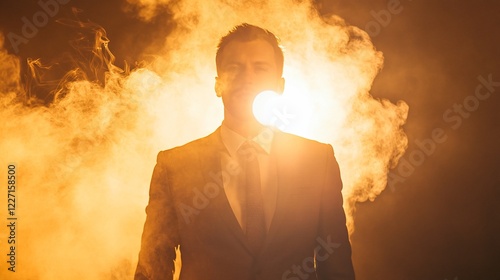 Man, suit, smoky, studio, backlight, mysterious, powerful, promotional, image, advertising